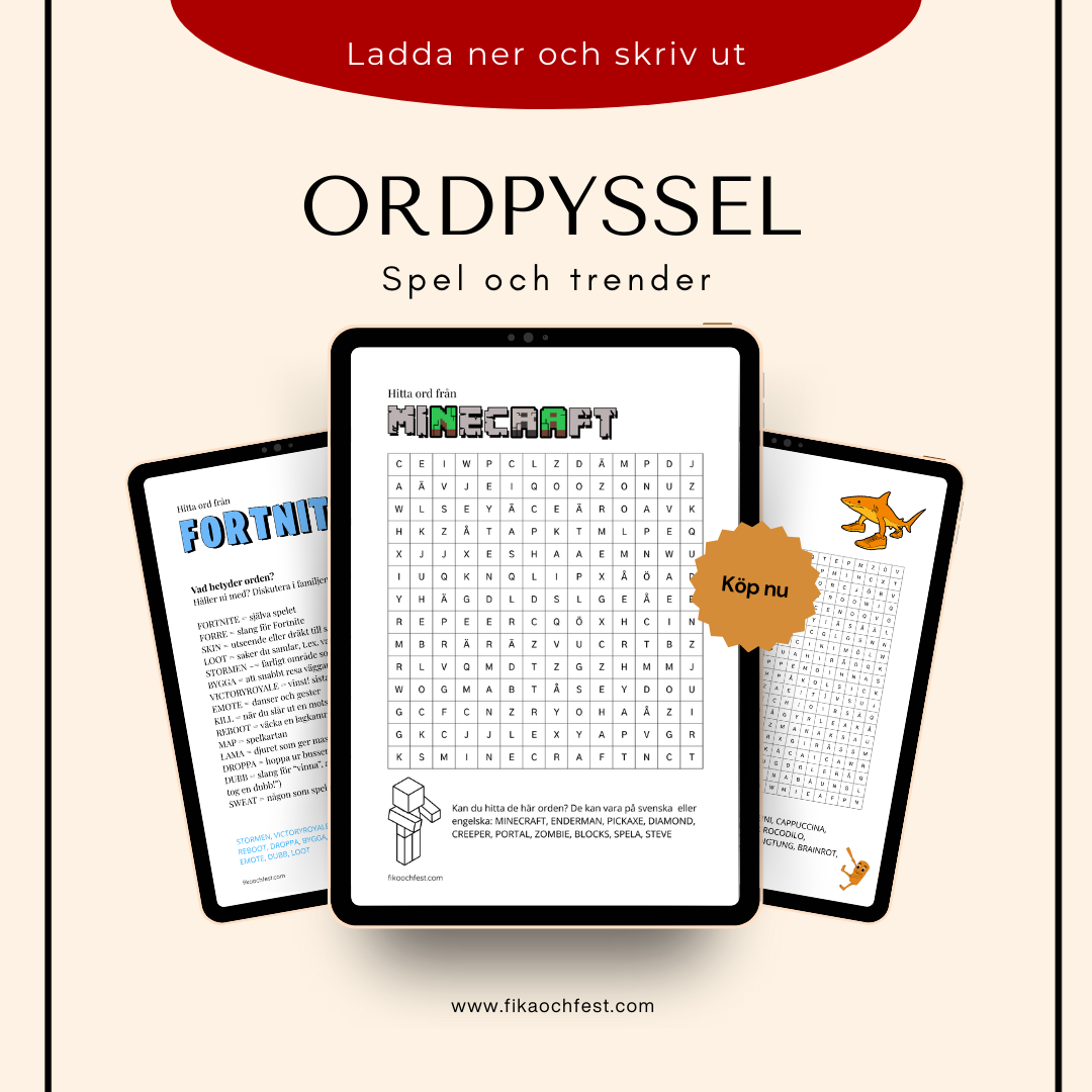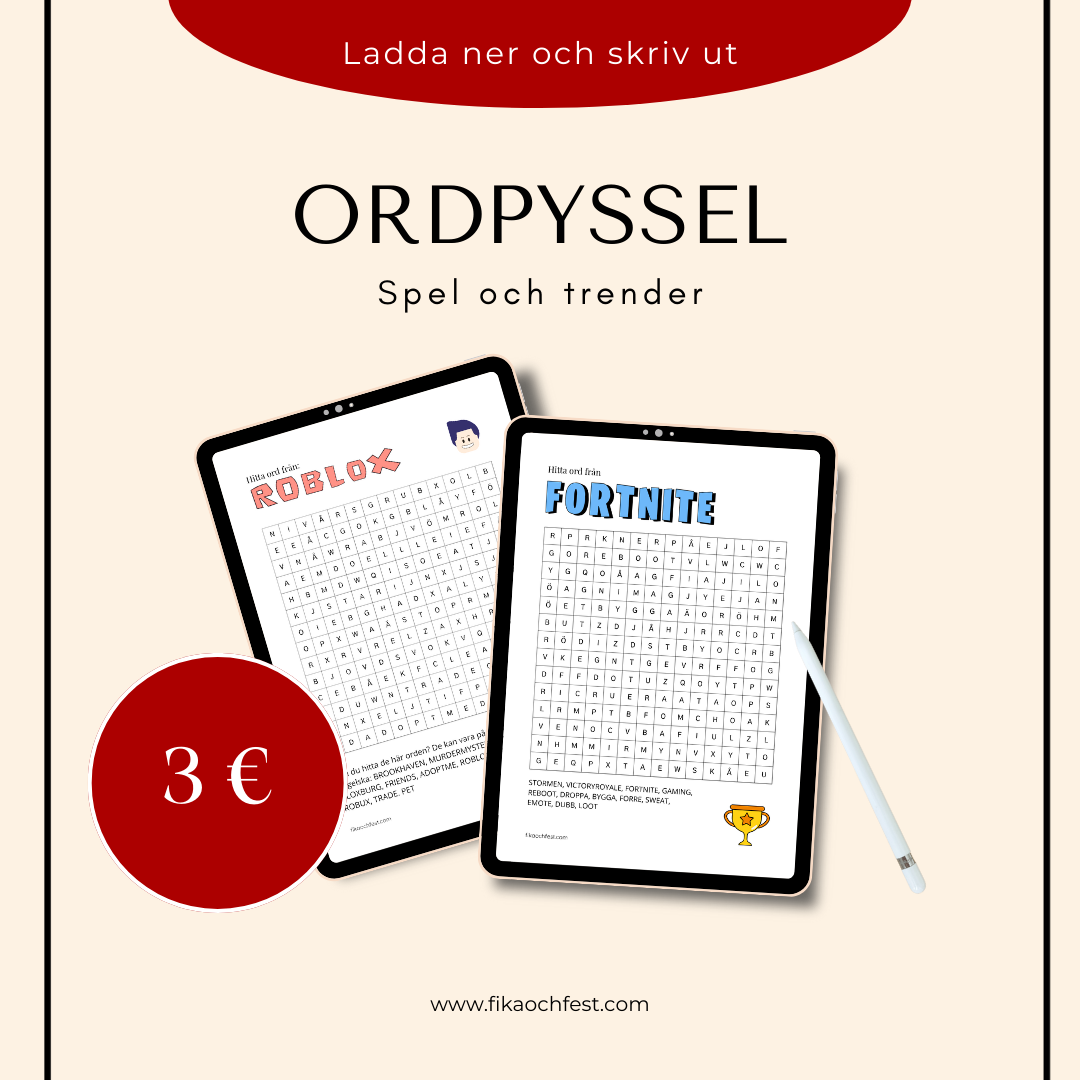 Ett roligt ordpyssel för barn som gillar spel! Hitta-orden-pyssel med kända ord från Roblox, Minecraft, Fortnite, Italian Brainrot och trender från 2025. Barn i lågstadieålder kommer garanterat att tycka om den här skärmfria aktiviteten. Ladda ner och skriv ut själv. Direktleverans efter betalning.