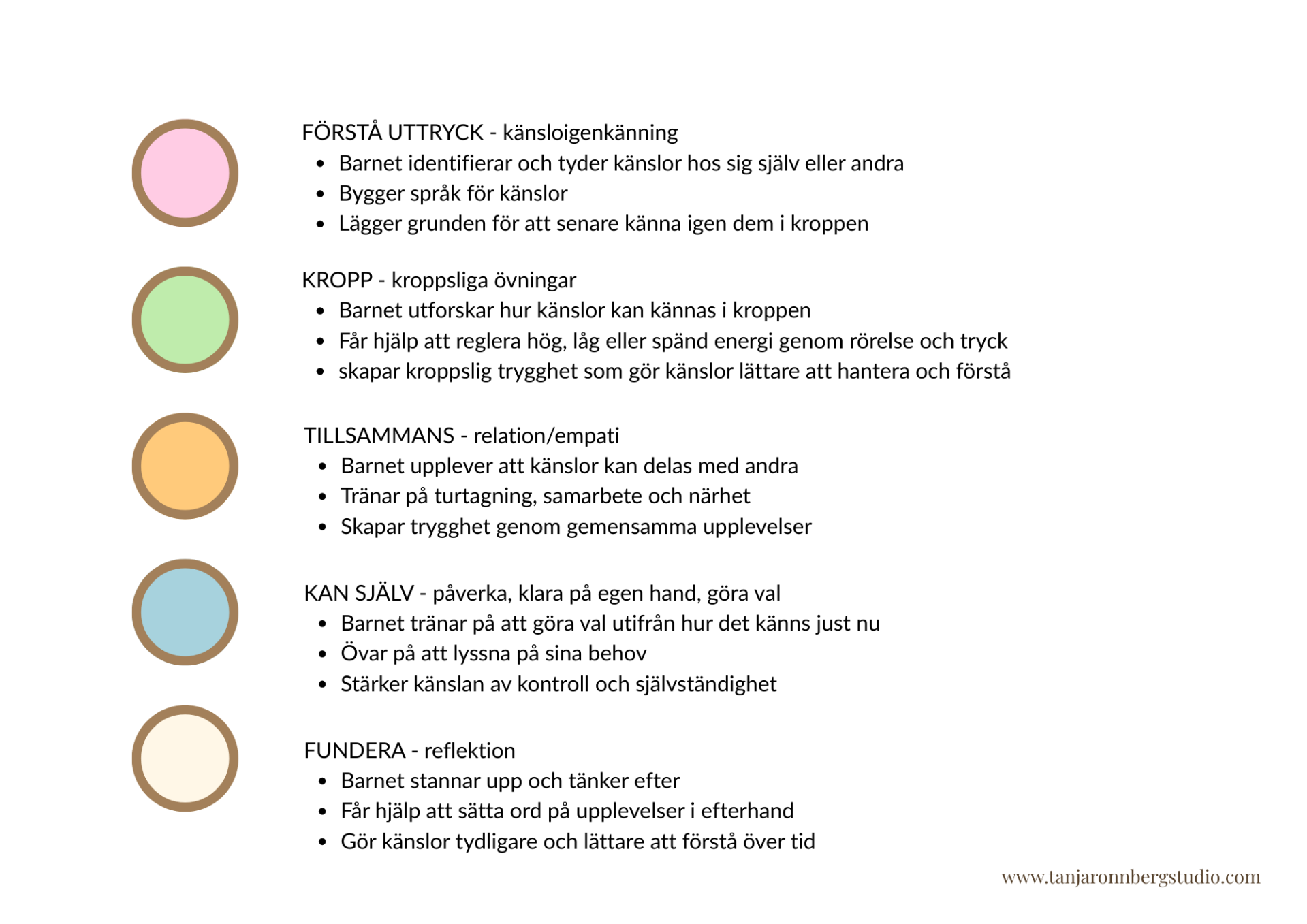 Barnet utforskar hur känslor kan kännas i kroppen Barnet får hjälp att reglera hög, låg eller spänd energi genom rörelse och tryck Skapar kroppslig trygghet som gör känslor lättare att hantera och förstå.