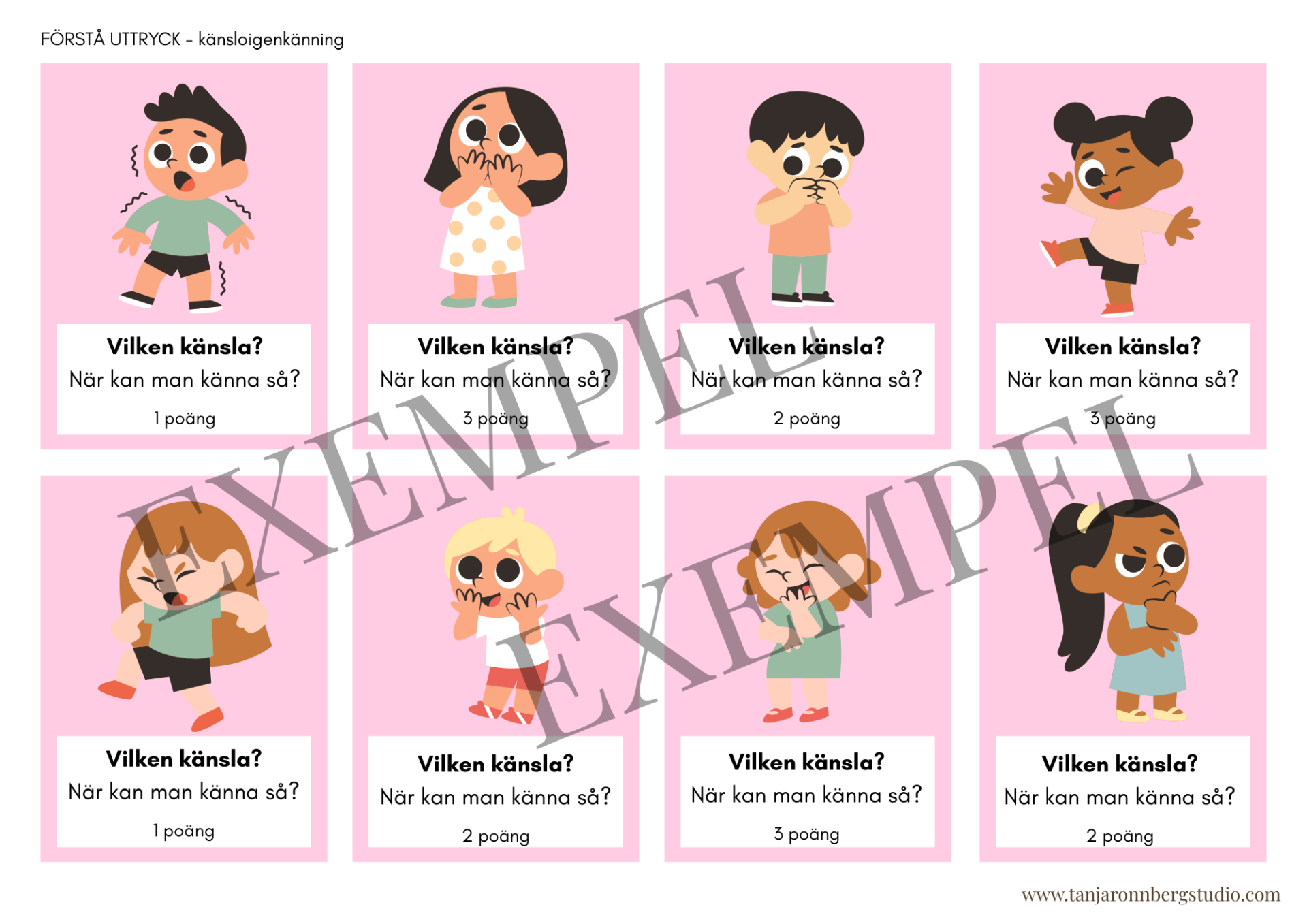 Ni laddar ner spelet, skriver ut och klipper ut korten innan ni börjar. När ni spelar drar ni kort som hjälper er att röra på er, fundera, berätta och förstå både små och stora upplevelser i vardagen. Allt kopplat till känslor!